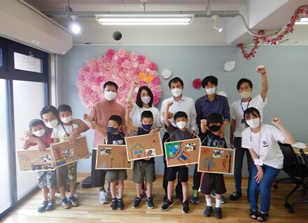 地域の小学生を招き、夏休みにモノづくり体験イベントを開催。弊社で出る廃材を使って写真立てを一緒に作成しました。