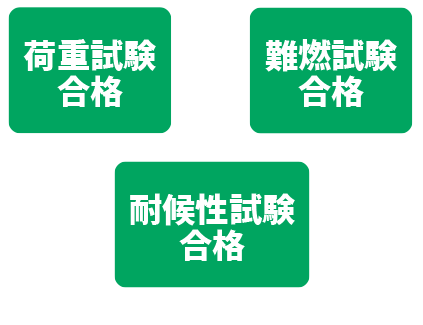 上⾯へ等分布荷重: 9 8 0 N ( 1 0 0 k g f ) に対し、底⾯固定状態での変位はわずか0.4mm。荷重試験をクリアし、優れた耐荷重性能を実証しています。さらに、合計3つの試験に合格。耐衝撃性、耐候性にも優れており、屋内外問わず安⼼してご利⽤いただけます。