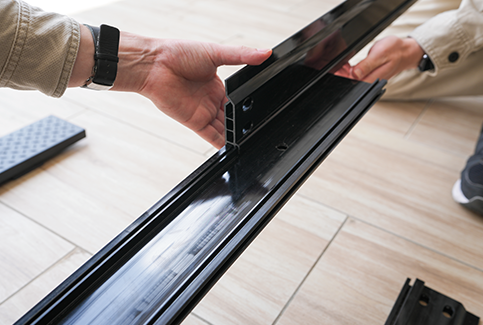 「シナジーダクト」はスライド式で組み込み時のボルトが不要。樹脂製のため現地加⼯が可能です。